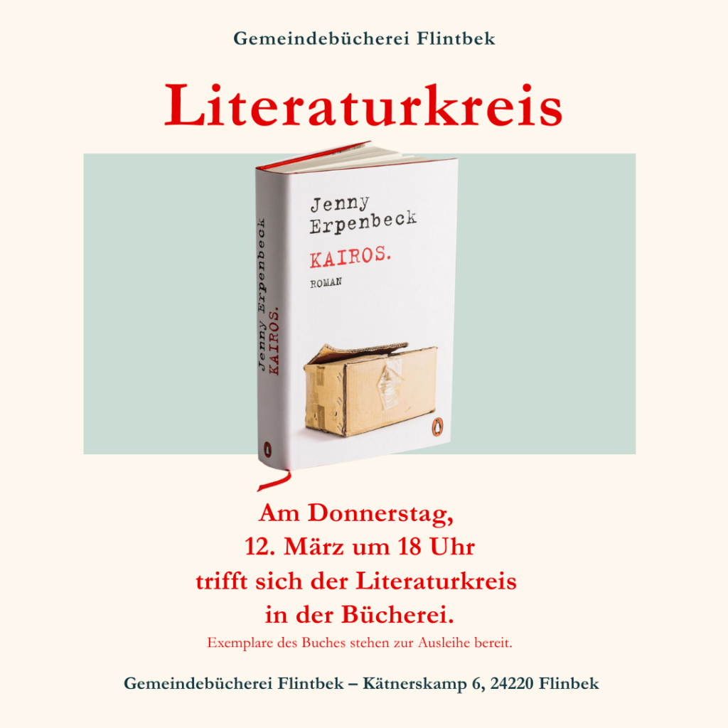 Am Donnerstag, 12. März um 18 Uhr trifft sich der Literaturkreis unter der Leitung von Ulrike Blumberg-Thiel zu dem Titel „Kairos“ von Jenny Erpenbeck.