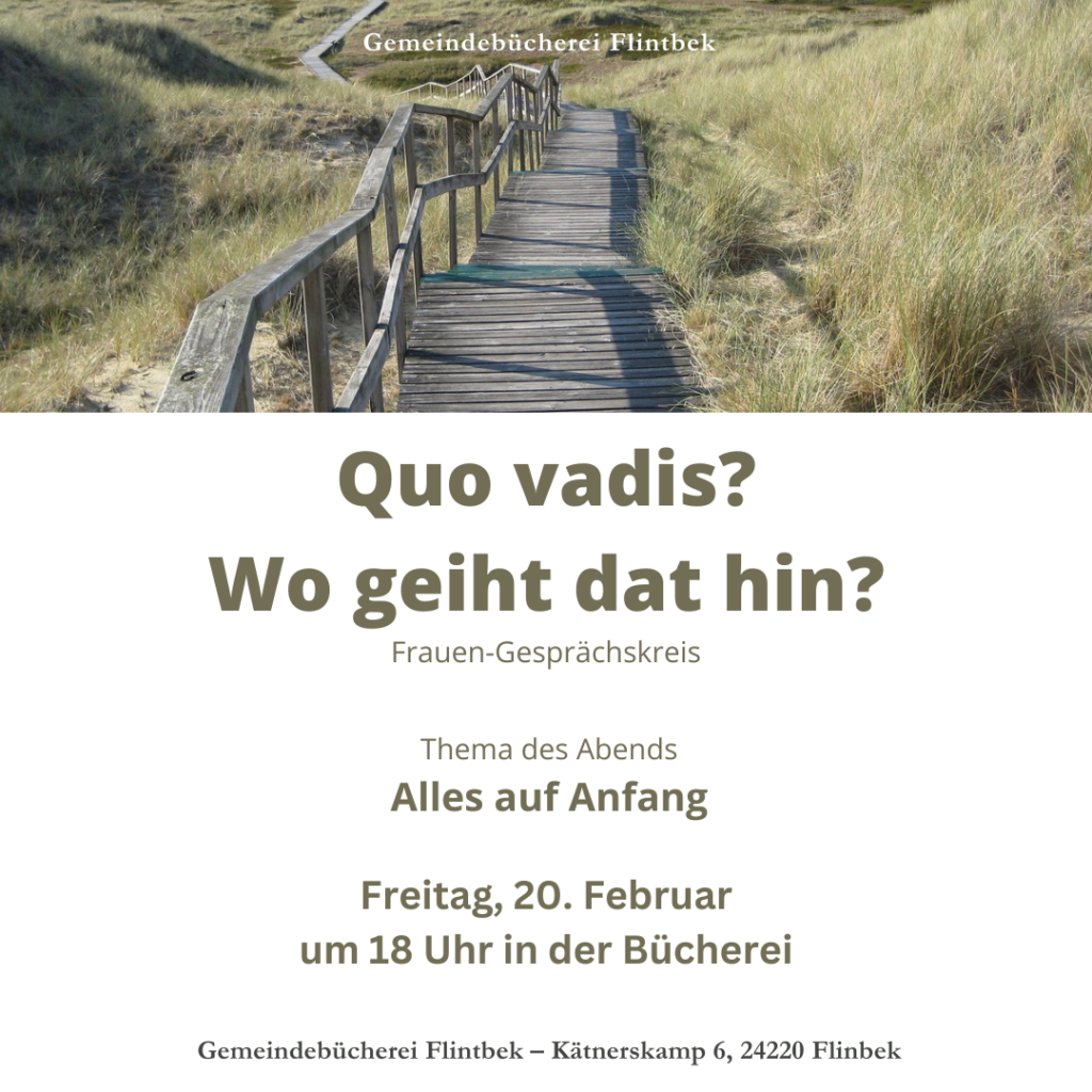 Am Freitag, den 20. Februar findet um 18 Uhr in unserer Bücherei der nächste Frauen-Gesprächskreis statt. Thema des Abends ist „Alles auf Anfang“. Wie sind wir in das Jahr gestartet? Was erwarten wir? Wo wollen wir hin?