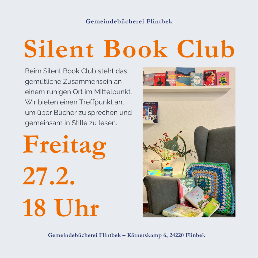 Wir laden zum Silent Book Club am 27.2. um 18 Uhr in die Bücherei ein. Von 18:30 bis 19:30 schalten wir unsere Handys stumm, machen es uns gemütlich und lesen in ruhiger Umgebung in der Bücherei.